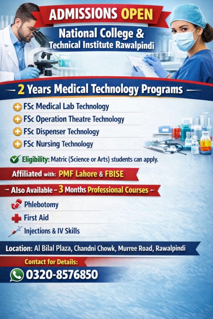 Admissions are now open at National College & Technical Institute in Rawalpindi for 2-year Medical Technology programs. Apply today for FSc Medical Lab Technology, Operation Theatre Technology, Dispenser Technology, and Nursing Technology. Students with Matric (Science or Arts) are eligible. The institute is affiliated with PMF Lahore & FBISE, ensuring recognized and quality education. Short 3-month professional courses including Phlebotomy, First Aid, and Injection & IV Skills are also available. Located at Al Bilal Plaza, Chandni Chowk, Murree Road, Rawalpindi. Contact now for details and secure your future in the medical field.